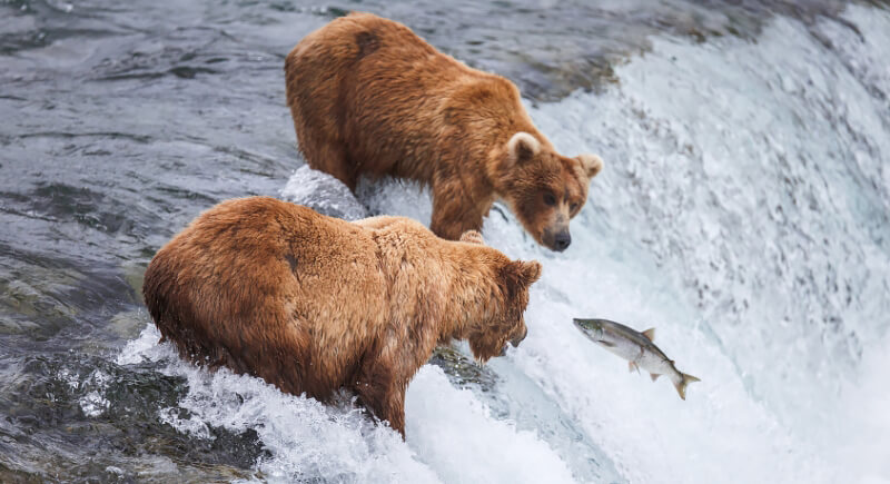 Their fall feeding frenzy, called hyperphagia, pushes calorie intake to extraordinary levels. A grizzly can consume up to 20,000 calories in a single day and may spend 20 hours foraging. Salmon, deer, roots, berries, insects, and even whale carcasses all make the menu. In Montana’s Glacier National Park, some climb to alpine slopes and eat tens of thousands of moths in a single day to maximize fat storage.