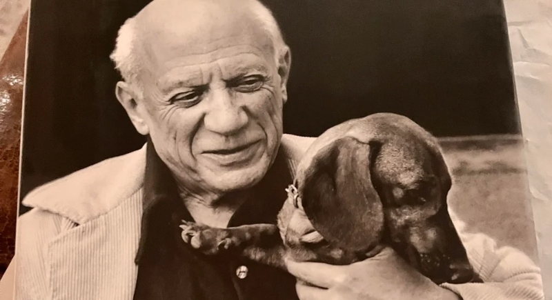 Lump arrived at Picasso’s home with photographer David Douglas Duncan in 1957. The dachshund stayed and appeared in several works, including a single-line drawing and a painted ceramic plate. Lump’s long body and calm posture suited Picasso’s style, which favored strong shapes and deliberate lines.