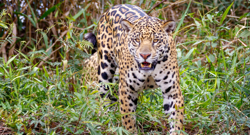 Near riverbanks in the Pantanal, jaguars often reveal their strength through water rather than land. Their sprint reaches about 50 mph, but the moment that sets them apart occurs when the chase ends in the shallows. A jaguar can grab a caiman or fish with the same confidence it uses on land animals.