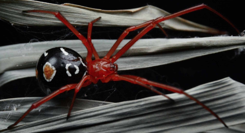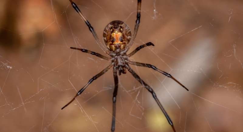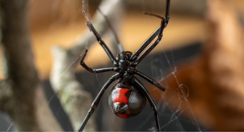 Glossy black with a red hourglass, the black widow thrives around stored items and low-traffic corners. Garages offer sheltered edges and a steady supply of insects. The venom targets the nervous system and can trigger muscle pain and cramps. Bites stay uncommon because this spider retreats quickly.