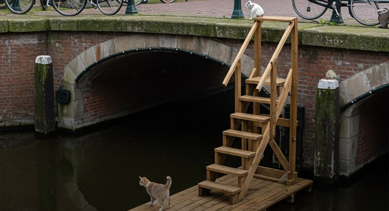 Investing €100,000 or roughly $120,000 to install small escape staircases along Amsterdam’s canals gives cats and other animals a way out after falling into the water. The city’s canals are steep, slippery, and dangerous for animals without exit points. The staircases are placed where incidents happen most often, based on rescue data.