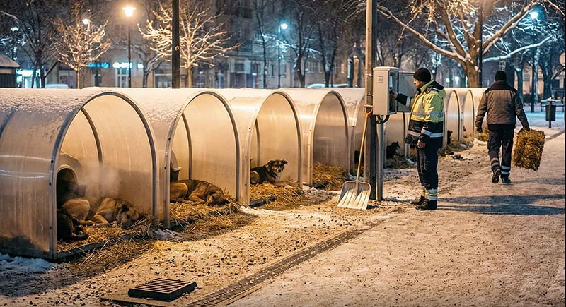 To protect stray dogs during extreme winter cold, Hungary has installed insulated thermal shelters. The shelters use enclosed designs that retain heat without electricity. They are placed in areas where street dogs commonly gather. Local animal welfare groups monitor usage during freezing conditions.