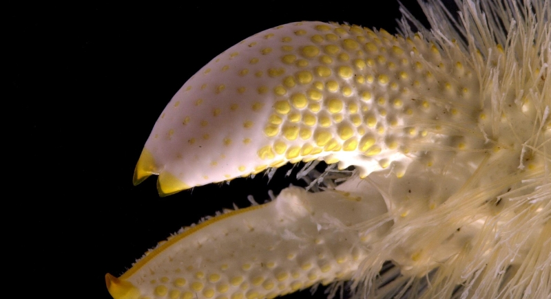 The setae provide a surface where bacteria can grow. Near hydrothermal vents, bacteria feed on chemicals like hydrogen sulfide instead of sunlight. The crab waves its claws through the vent water, supplying the bacteria with the compounds they need to thrive.