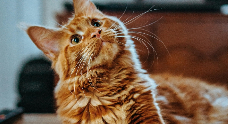 This giant breed often shows off classic tabby markings in reddish-orange shades. With tufted ears and bushy tails, they have a snow-cat build that looks more mountain-ready than most house cats. Despite their size, Maine Coons aren’t aggressive. They also tend to be chatty, often with chirps that sound nothing like a typical meow.