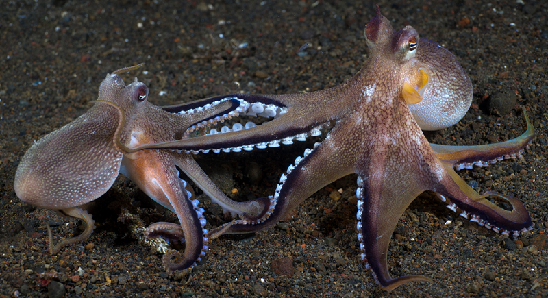 Gloomy octopuses usually live alone, but Jervis Bay pushes them closer together. Fine sediment makes stable dens difficult, while discarded scallop shells offer solid building material. The more octopuses that move in, the more shells appear. Dens end up packed side by side.