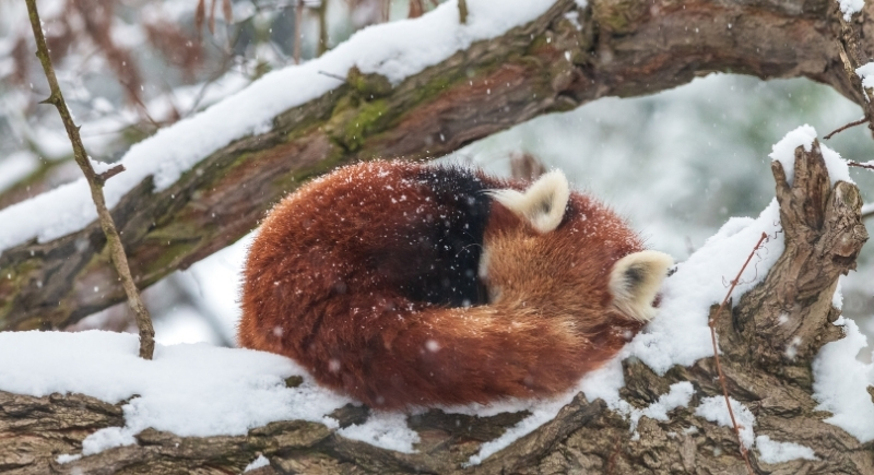 Red pandas wrap their fluffy tails around their bodies while sleeping to stay warm in cold mountain forests. It looks adorable, but it’s a survival tactic in harsh conditions. Habitat loss and climate change make these cozy moments increasingly fragile, adding quiet sadness to an already vulnerable species.