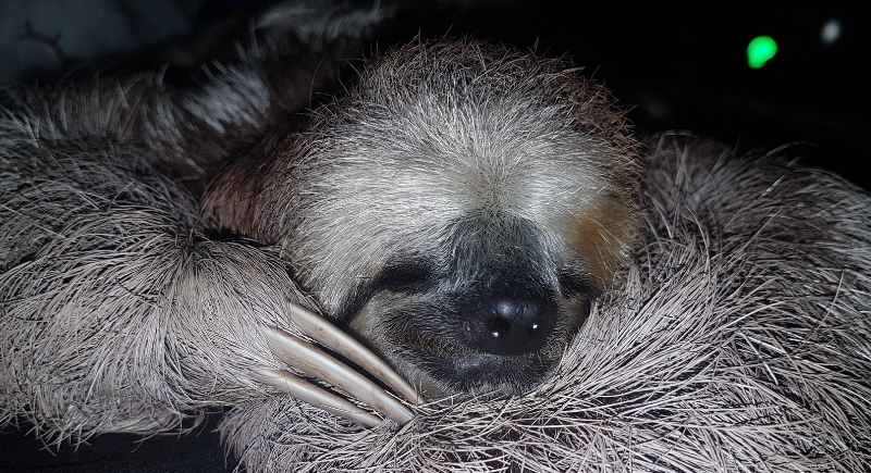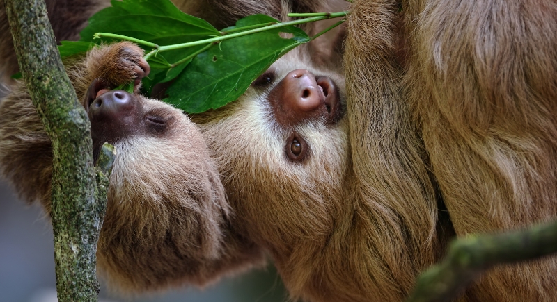 Life happens upside down for sloths, including sleeping, eating, mating, and giving birth. Their long, curved claws lock onto branches with little effort and allow them to hang without burning much energy. Descending to the forest floor is rare and risky, which is why staying aloft is the default setting.