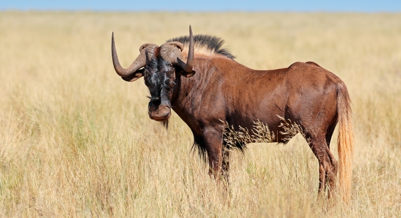 This species inhabits highland grasslands and has a distinctive appearance, characterized by forward-curving horns and a white tail. Adults can run at speeds of up to 50 miles per hour. Unlike the blue wildebeest, this one is not widespread across Africa. It’s found only in South Africa’s central interior.
