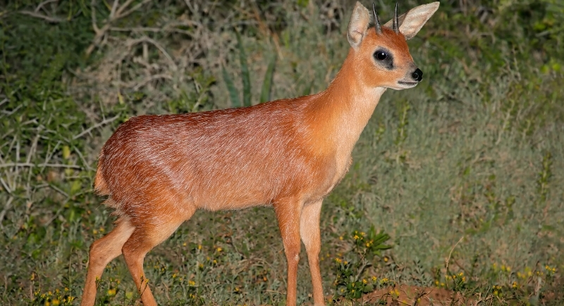 About the size of a medium dog, this reddish antelope is solitary and usually active at night. It browses low vegetation and has been seen nibbling plants in vineyards along the southern coast. When threatened, it stiffens its body hair to appear larger, an unusual yet effective tactic.
