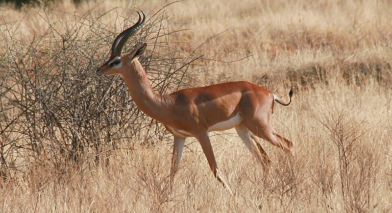 Gerenuks eat moisture-rich plants and leaves. Their height allows them to reach trees that other animals can’t. Even during drought, they stay upright on their hind legs to browse for the juiciest greens.