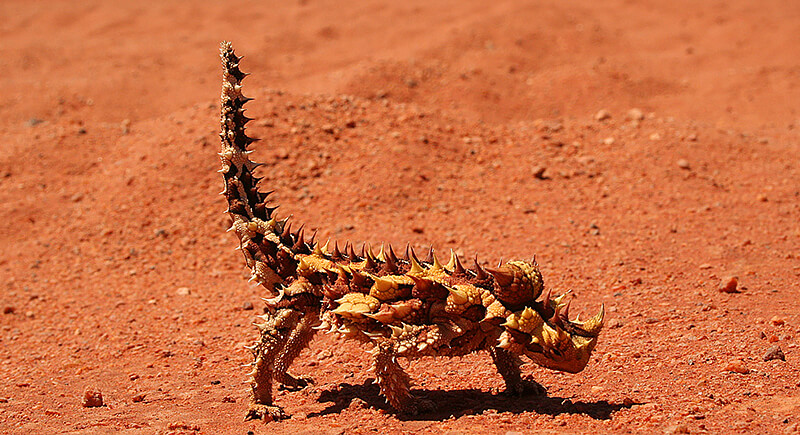 Native to Australian deserts, the thorny devil has skin with grooves that collect water from morning dew or rain. The moisture travels along the skin’s channels straight into its mouth. It doesn’t even have to move. Even the way it walks helps funnel water when it steps into damp patches.