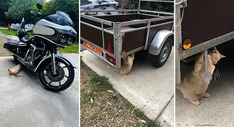 Most cats are happy chasing bugs or stretching out in a sunny spot. This little orange cat, however, decided to do something else. Her owner, Reddit user Lost_Design_9930, caught her sliding under a motorcycle with just her legs poking out, exactly like a mechanic on the clock.