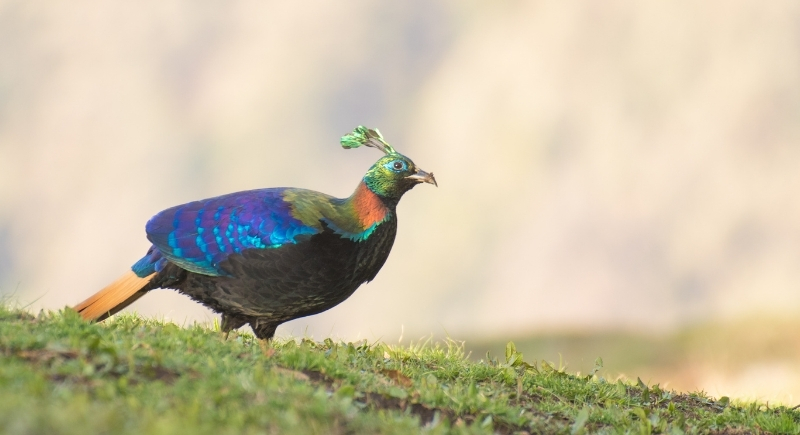 The Himalayan Monal measures about 24 to 30 inches long and belongs to the pheasant family Phasianidae. Adult males carry a metallic green crest, coppery feathers across the back and neck, deep blue and purple tones along the body, and a bright white rump that flashes in flight. The tail feathers shift into rufous shades that darken toward the tips.