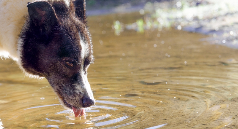 Many natural water sources contain harmful pathogens. Leptospira bacteria can cause leptospirosis, a serious illness that affects the kidneys and liver. Giardia, another common parasite in standing or slow-moving water, causes severe gastrointestinal problems. Dogs should only drink clean water brought by their owner.