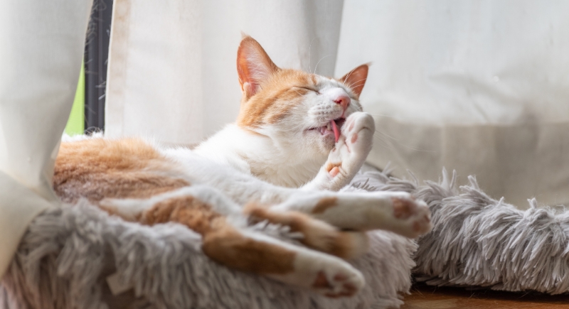 Proximity during grooming signals comfort and emotional regulation through shared presence. Kitties groom to regulate stress levels, so doing it beside their favorite person mirrors social grooming behaviors seen between bonded cats.