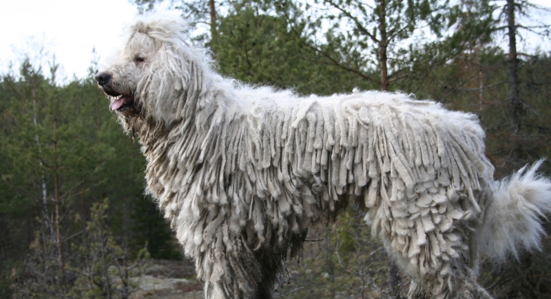 The Komondor is known for its naturally corded coat, which develops as the dog matures and forms dense white cords. This coat helped the breed blend into sheep flocks and provided protection while guarding livestock. Originating in Hungary, the Komondor was bred for independent territory defense, making secure fencing an important consideration for owners.
