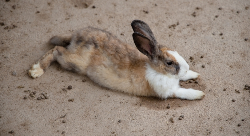 A rabbit lying on its back or side, with its legs stretched out, is deeply relaxed. This position exposes vulnerable areas, which means the rabbit feels safe. The pose can appear alarming to people unfamiliar with it.