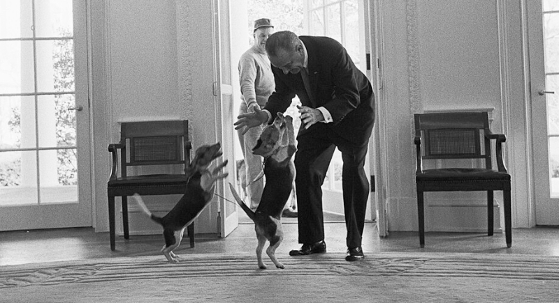 President Lyndon B. Johnson’s two beagles, Him and Her, were constant companions during his presidency. They were a common sight on the White House lawn, where LBJ would often walk them. In 1964, Him made headlines when LBJ was photographed lifting him by the ears, causing a public outcry that required an official statement defending the president’s actions.