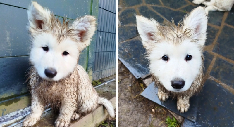 The photos showed a once-bright White Swiss Shepherd now caked in mud, sitting with the kind of pride only a dog can have after a good romp outside. His transformation was so complete that many people guessed he was a Samoyed or Husky, but the owner quickly clarified his breed. Commenters filled the thread with laughs and praise, calling him “the cutest mess ever.”