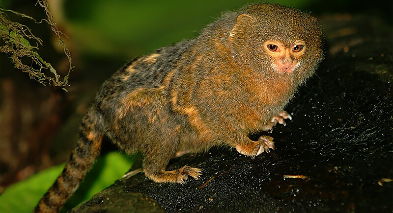 This South American monkey rarely grows longer than five inches. It feeds by gnawing into tree bark and licking up sap and resin, which make up most of its diet. Despite its size, the pygmy marmoset has a surprisingly loud call that helps it stay in touch with its group.
