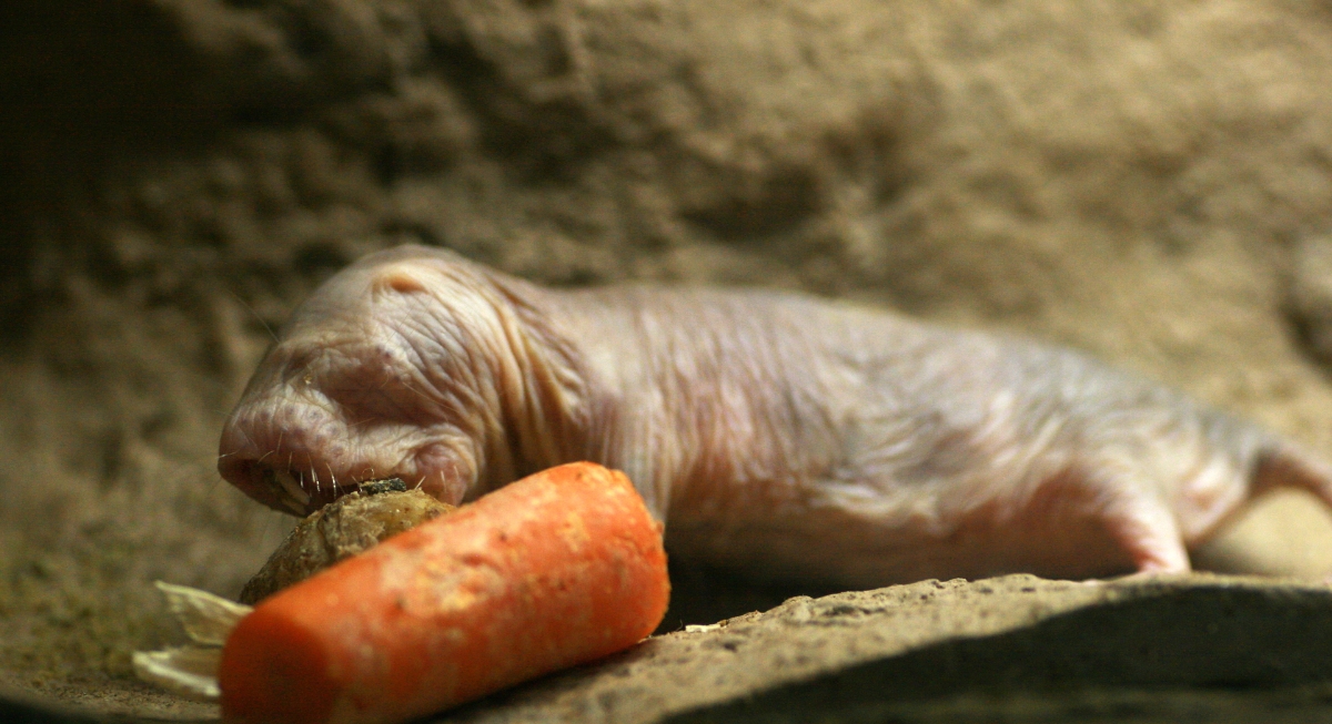 The naked mole rat spends its entire life in narrow underground tunnels, where smooth, nearly hairless skin helps it move easily without friction or overheating. Fur would get in the way in such tight spaces. Its wrinkled body and large front teeth give it an unusual look, but each feature supports how it digs, navigates, and survives below the surface.