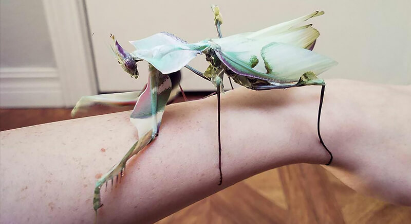 Native to East Africa, devil’s flower mantis camouflages itself as an orchid, then waits motionless for unsuspecting prey. Its wings flash with warning colors when threatened, but when hunting, it’s nearly invisible. The mantis grows large—up to 5 inches—and prefers other insects that mistake it for a real flower.