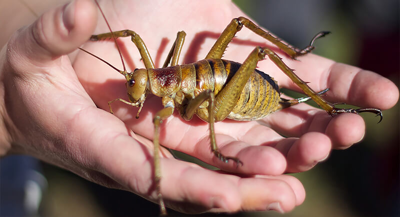 New Zealand’s giant weta is a large cricket relative found mainly on protected offshore islands. Some individuals can weigh more than a sparrow and rank among the heaviest insects known. They do not fly and move slowly. Conservation efforts focus on keeping their habitats free from introduced predators.