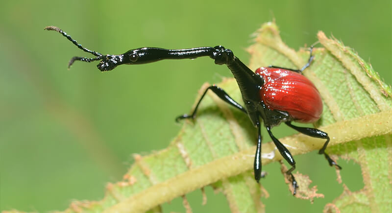 Male giraffe weevils have dramatically elongated necks, often as long as or longer than their bodies. The elongated neck helps them joust with rivals during mating season. Females use plant leaves to wrap and roll their eggs into protective pods, slicing them free so they fall to the forest floor.