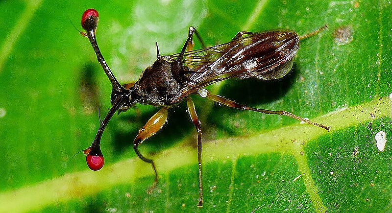 These flies don’t keep their eyes where most insects do. Males grow long lateral stalks from the sides of their heads, with bright red eyes sitting on the ends like tiny cherries. It’s all about competition—females often choose mates with the widest spacing. Males use their rigid eye stalks as visual signals during rival confrontations.